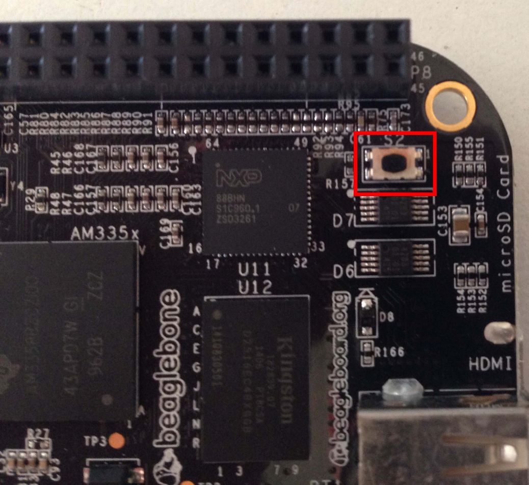Il y a aussi une grosse différence au niveau du support de stockage. Sur RPi sans carte SD ou Micro-SD vous ne pouvez rien faire, car elle sert de disque dur. Le BBB est mieux pensé et intégré à la carte, vous avez 4Go de eMMC qui peuvent faire tourner Debian d’origine, mais vous pouvez également installer une autre distribution si vous préférez… Laissant ainsi la carte Micro-SD accessible comme un périphérique… Sinon vous pouvez aussi choisir de booter depuis une carte Micro-SD en appuyant sur un bouton au démarrage et en préparant la Micro-SD avec une commande dd ou avec un programme tel que WinDiskImag32… Ce qui vous permet alors d’avoir plusieurs systèmes d’exploitation sur plusieurs cartes différentes comme avec un RPi… Pratique non? Encore plus utile, si vous décidez d’utiliser votre BBB avec uniquement des cartes Micro-SD vous pouvez souder deux pattes du bon bouton pour ne pas devoir le tenir à chaque démarrage…