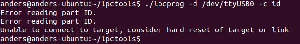 sudo lpcprog -d /dev/ttyUSB0 -c id